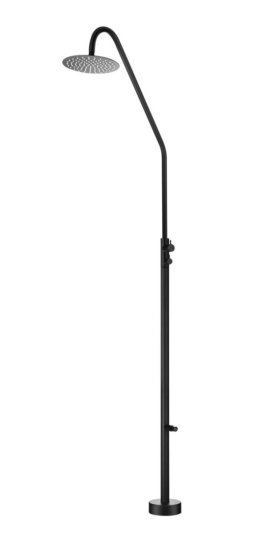 Ducha exterior Dakota en acero S.316 con acabado negro mate, ideal para piscina y jardín. Mantiene rociador superior redondo de 25 cm y salida inferior tipo lavapiés, con inversor y maneta 1/4 de vuelta. Monofluido (solo agua fría), conexión 1/2" y montaje a suelo con base estable.
